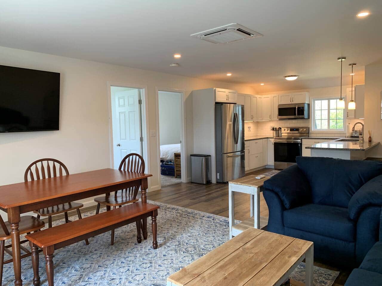 This 2 bedroom unit was built in 2021 with modern amenities... large gourmet kitchen with granite countertops and full sized stainless steel appliances. Enjoy the spacious great room with a 65" smart TV, a cozy sitting area, and dining tables and chairs for 6. Both bedrooms are furnished with brand new queen beds, dressers and bedside tables. Super fast free WiFi. Drive to Middlebury in minutes. Clean and comfortable. This spacious, well appointed apartment will make you want to stay forever!